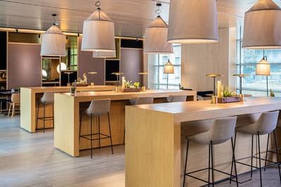Bienvenue au Innside by Melia Milano, niché dans la sublime tour rénovée Torre Galfa, au cœur de Milan ! Avec ses baies vitrées qui recouvrent entièrement la façade, la vue de fou sur la ville est assurée ici ! Et c’est justement cette ouverture constante sur l’extérieur qui fait tout le charme de l’hôtel. Vous baignez dans l’énergie citadine milanaise ! Au pied de la tour de 30 étages, vous êtes accueillis par des pots d’arbustes qui sentent le soleil à plein nez. Et à l’intérieur, la déco est tout simplement canon avec des fauteuils dorés en velours bleu et du bois clair partout. L’hôtel est résolument pensé pour un public jeune, avec des coins sympas où se poser avec un café pour chiller ou écrire tranquillement. Très coffeeshop contemporain ! La salle de resto est juste sublime avec ce dialogue de bleu et de bois clair et ces énormes lanternes en guise de luminaire. Très minimaliste dans l’esprit ! Sur place, vous pouvez faire du sport grâce à une salle tout équipée et le wifi est franchement performant. Les chambres sont dans le même esprit que tout le reste : less is more mais un maximum de confort ! Bref, une valeur sûre, cet hôtel près de la gare ! Et les petits déjeuners en buffet sont copieux et au top.