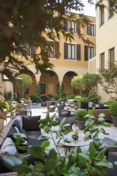 Goûtez au luxe à la milanaise en plongeant dans l’univers du Mandarin Oriental Milan ! Une pépite de luxe et d’élégance nichée à l’intérieur de bâtiments datant du 18e siècle. Des bâtiments à la fois chaleureux et raffinés avec cette pierre chaude qui se charge de soleil... Le lieu recrée l’ambiance d’une résidence milanaise du début du XXe siècle avec des tons doux, du bois de chêne et de délicieux velours qui viennent caresser l’oeil. Dans le lobby, le marbre noir qui s’étale sous nos pieds donne le ton : c’est de l’exceptionnel qui vous attend. Avec cette touche extrême-orientale apportée par le groupe hôtelier. Ciao les boutons de porte en forme de gongs ! Dans les chambres, c’est la volupté absolue avec de l’espace, du zen et des matières haut de gamme. Vous allez totalement craquer sur le patio intérieur avec sa terrasse tout droit sortie d’un rêve : des petits arbustes et cette ambiance dont les Italiens ont le secret... Vous allez vous régaler, ici ! Que ce soit au resto 2 étoiles ou au bistrot, avec sa cuisine italienne délicieuse dans un décor audacieux tout en noir et blanc. So rétro ! Et in fine, vous ne pourrez pas repartir sans faire un plouf dans la piscine intérieure sublime. Bref, cet hôtel est une bulle de bien-être et de détente à fond dans l’esprit milanais. On adore.