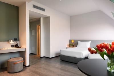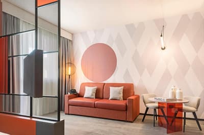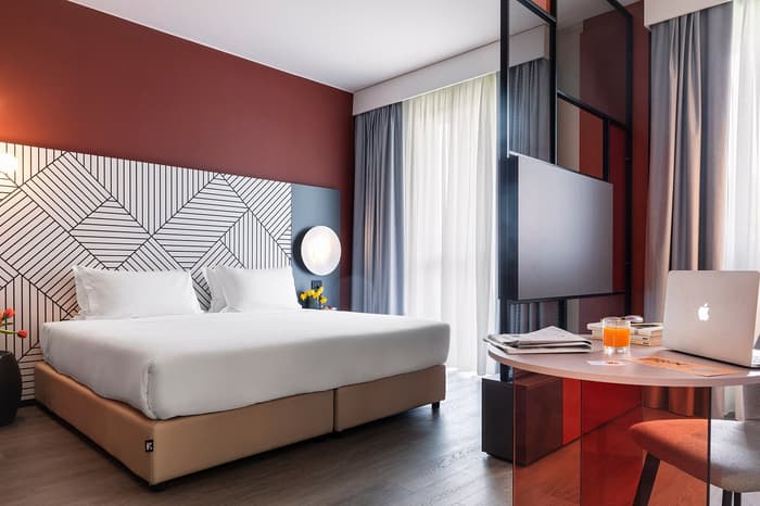 Au cœur d’un bâtiment typique de l’architecture italienne des années 1970 se cache le tout nouvel hôtel Quark, un resort urbain design et entièrement repensé pour les digital nomades et les travellers. Avec 283 chambres et 4 restaurants et bars, ici on voit les choses en grand ! Tout est fait pour rendre votre voyage plus smart et plus connecté : wifi à tous les étages, téléviseur intelligent, espace de télétravail. Après avoir fait des folies dans le quartier de la mode, vous pourrez facilement vous poser, ouvrir votre laptop et checker vos mails ou mater votre feed Insta. Une petite faim ? Alors direction le restaurant de l’hôtel où un chef étoilé propose une cuisine d’auteur très quali. C’est rare dans ce type d'établissement, alors forcément on kiffe ! Du côté des chambres, on voulait faire un petit focus sur le Studios' Floor qui offre un concept d’hospitalité hybride, à mi-chemin entre le 4 étoiles et un Airbnb, pour se sentir vraiment comme chez soi. Très comfy !