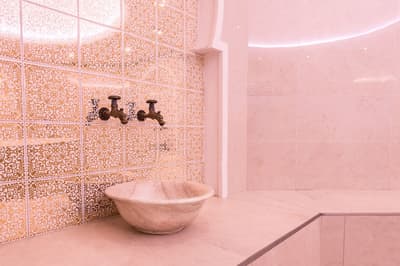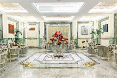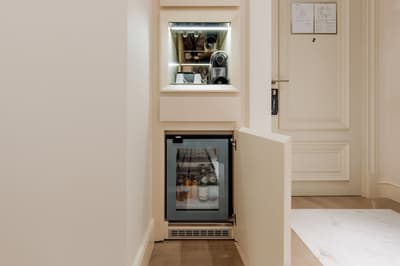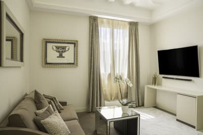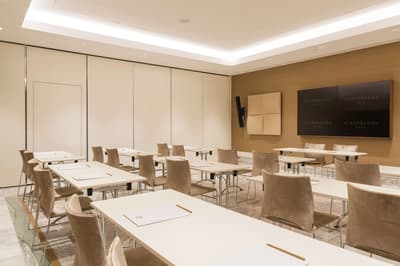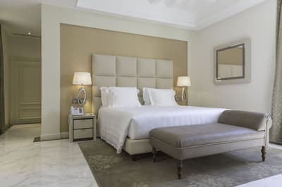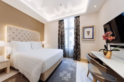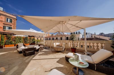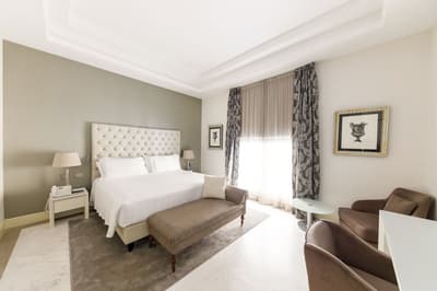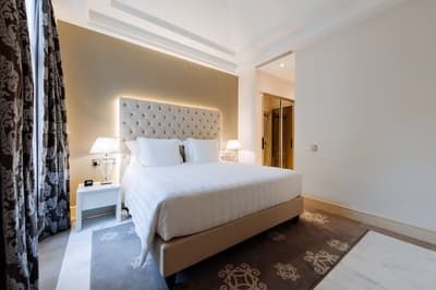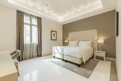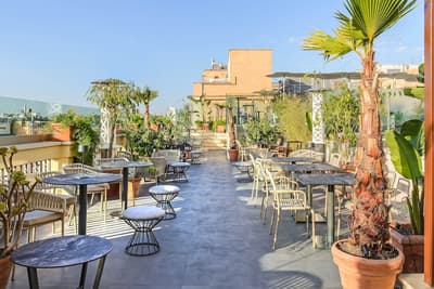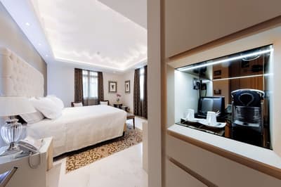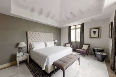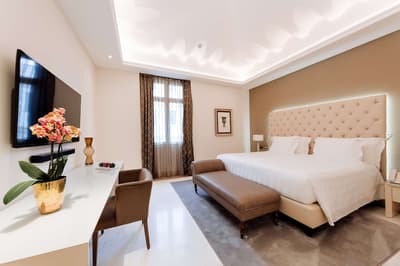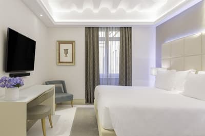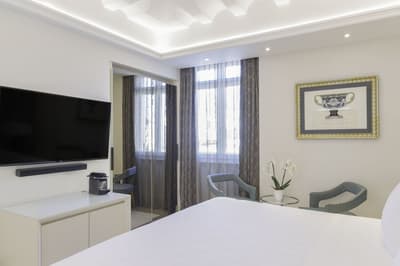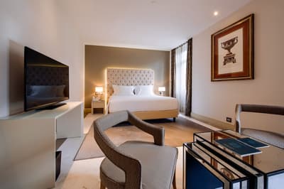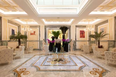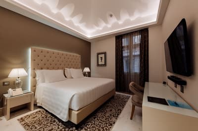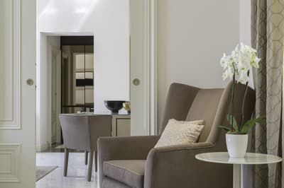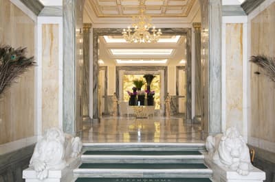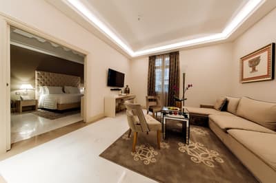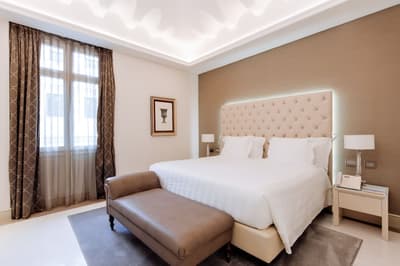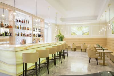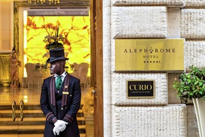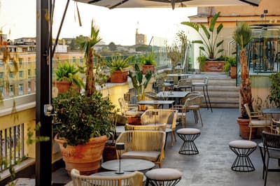 Une banque italienne des années 30 devenue hôtel ! L’Aleph Rome Hotel a préservé l’architecture historique de cet ancien palais. Dans le lobby, le sol en marbre vert de Cipollino a été conservé. Quant au sous-sol, transformé en espace bien-être avec hammam, sauna, jacuzzi et salle de sport, il a gardé les traces du passé : l’hôtel a choisi d’intégrer l’ancienne porte de la chambre forte à sa déco ! Vous aurez la sensation de pénétrer dans une salle des coffres pour accéder à la fitness room... En clin d’œil aux années 30, l'Aleph Roma a aussi imaginé le Cognac Lounge, un salon-fumoir qui séduira les amateurs. Confortablement installés dans des fauteuils en cuir vert, vous pourrez y savourer cigares et spiritueux. Mais du sous-sol au toit, l'hôtel n’a pas fini de vous surprendre. L’Onyx Bar, avec son comptoir blanc minéral et ses luminaires en verre transparent, vous accueillera à l’heure de l’apéro et en soirée, dans une ambiance carrément lounge. Et au dernier étage, la vue de la terrasse du Sky Blu Restaurant est à juste couper le souffle ! Cherry on the cake : une piscine avec transats et cocktails signatures vous y attend. Et sinon, parmi les 88 chambres et suites que compte l’Aleph Rome Hotel, on parie que vous craquerez pour la Barberini Suite... A vous son grand espace salon-repas, mais surtout sa terrasse aménagée et meublée de 80m2 avec vue sur Rome !