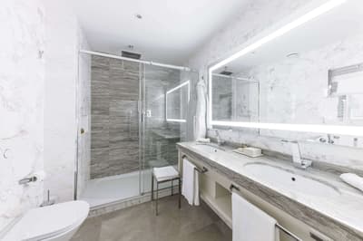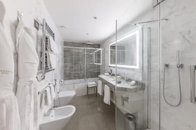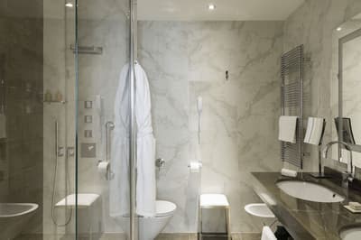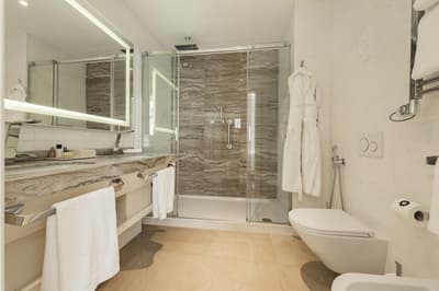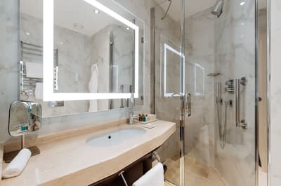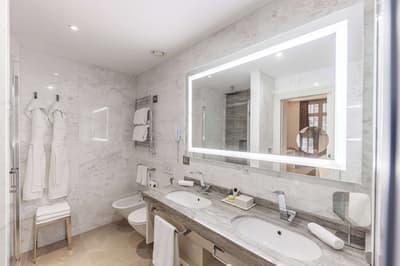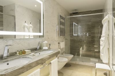 Plus spacieuse, elle est encore plus confortable. Cette belle chambre a tout le nécessaire pour un séjour reposant et serein. La grande fenêtre profite d’une belle vue. Elle accommode un grand lit et dispose de beaux fauteuils dans un coin de la pièce. Salle de bain chic avec douche à effet de pluie.