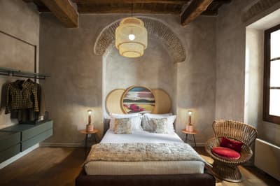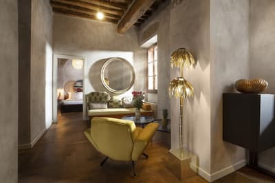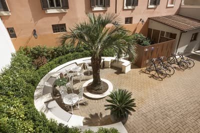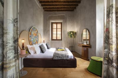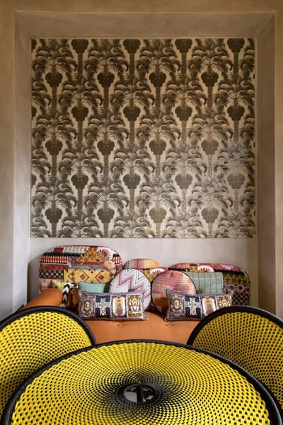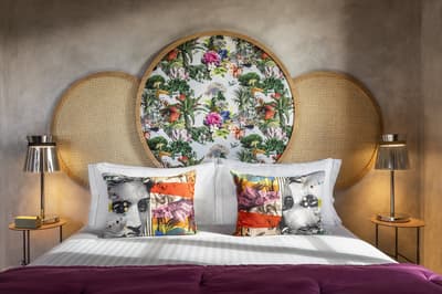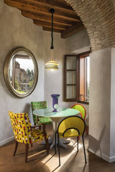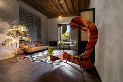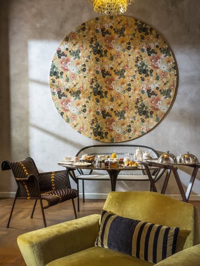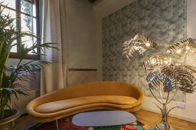 L’exotisme à l’italienne ! Aménagé dans une élégante bâtisse du 18e siècle, l’hôtel le Palm Suite a des airs d’oasis tropicale en plein centre historique de Rome. La déco fleurie joue avec les couleurs et les imprimés. Du mobilier moderne et tout aussi coloré participe à cette ambiance insolite. Dès les premiers pas dans le lobby, vous avez cette impression d’oasis luxuriante, avec cette banquette aux lignes rondes, en forme de haricot orangé, et ces plantes vertes installées un peu partout. Des papiers peints verts et des luminaires dorés en forme de palmiers accentuent encore l’effet. Même sensation dans les suites : meublées avec du mobilier design, de couleur flashy, elles jouent aussi avec les imprimés. Ici, le décor mélange le bois, la pierre et les motifs floraux. Et le Palm Suite a conservé ses poutres apparentes et ses parquets en bois clair, comme dans la Grand Plam Suite avec vue. Celle-là, on parie que vous craquerez pour ses voutes en pierre et sa charpente apparente ! Elle dispose de deux chambres, deux salles de bains et un salon meublé avec des fauteuils imprimés façon jungle. Et elle offre une vue juste unique sur le Forum Romain ! Mais le Palm Suite n’a pas livré tous ses secrets, puisqu’un restaurant gastronomique et étoilé vous attend pour un diner sur sa terrasse so romantique, avec vue sur le Colisée... Et l’hôtel dispose également d’un bar à cocktails, The Court. Lequel figure au Top 100 des bars dans le monde, plutôt sympa non ?