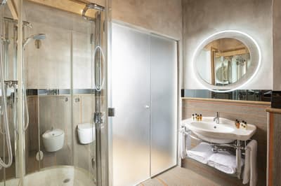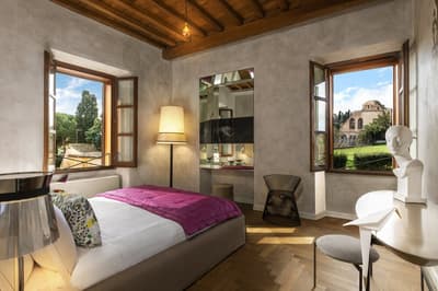 Très spacieuse, elle est très agréable et confortable. Une vue merveilleuse sur le Forum historique de Rome peut être appréciée par ses grandes fenêtres. Elle accommode un grand lit et dispose d’un coin salon aménagé d’un canapé-lit et de beaux fauteuils. Salle de bain chic.