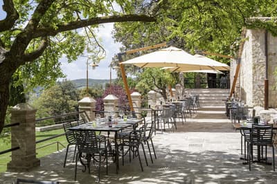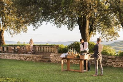 Bienvenue dans l’éternelle campagne toscane, avec vue sur les collines, les oliveraies et les vignes de Volterra ! Ici, le temps est comme suspendu. Le Borgo Pignano est à l’image d’un village médiéval, un mélange réussi de cottages cosy et de vieilles bâtisses en pierres blondes. Parmi elles, un palais pittoresque, avec son toit terrasse à créneaux, sa corniche à arcades et ses fenêtres géminées... Un Palazzio Vecchio version rurale en somme ! A l'intérieur, plafonds en carène, moulures peintes, fresques végétales en trompe-l'oeil, mobilier XVIIIème et tomettes patinées lui donnent un charme fou ! La nature est omniprésente, enchaînant les terrasses, les pergolas, les restanques, les étangs, sans oublier le ruisseau qui irrigue les champs. Il y a de quoi s’occuper sans jamais quitter le domaine ! Laissez-vous tenter par la visite de la ferme cultivée en biodynamie, du laboratoire de plantes médicinales ou encore par un atelier de fabrication de miel ! Partez à cheval dans la forêt environnante ou dans un tout autre registre, flânez dans la galerie d’Art contemporain ! Offrez-vous un moment de bien-être sous les voûtes du spa ! Ou encore plongez dans la piscine à débordement ! Taillée à même la roche, en surplomb du paysage, c'est une merveille. On a oublié les kids dans tout ça ? Pas d’inquiétude, le club enfants s'en occupe. Sonne enfin l’heure de l’apéro ! Vous êtes plutôt de la team Negroni ou de la team Prosecco ? Qu'à cela ne tienne ! Rendez-vous au Belvedere cocktails bar...
