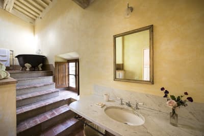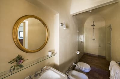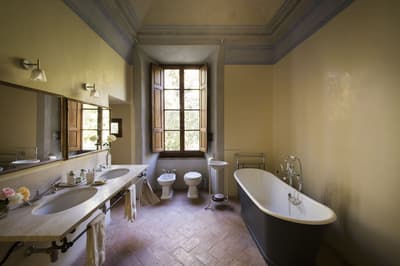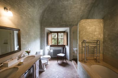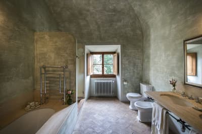 L’ensemble est dans un style de décoration contemporain et charmant et est joliment meublée avec un intérieur luxueux de style toscan et présente des détails architecturaux d'origine, des plafonds voûtés, des meubles anciens et des draps italiens. Vous trouverez deux grandes chambres doubles dans une suite et une grande chambre double ainsi qu'une chambre simple attenante dans l’autre. Après vos activités de la journée, vous pourrez vous rafraîchir dans la salle de bains commune en marbre et travertin équipée d’une baignoire et d’une douche. Le tout dans une ambiance relaxante !
