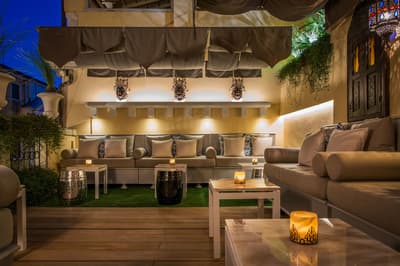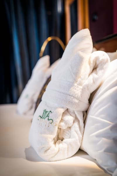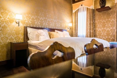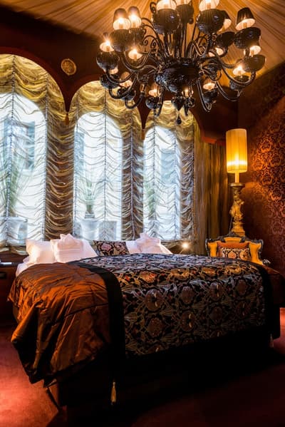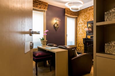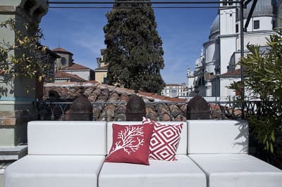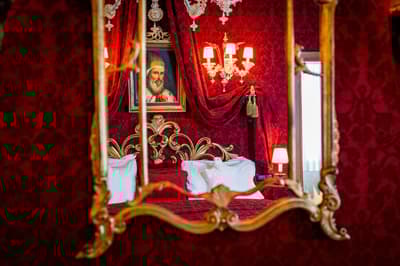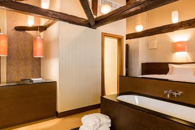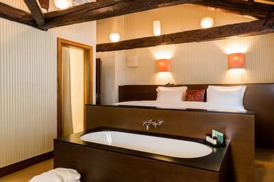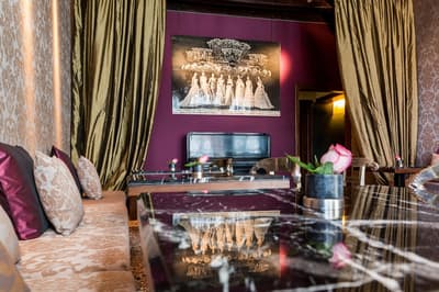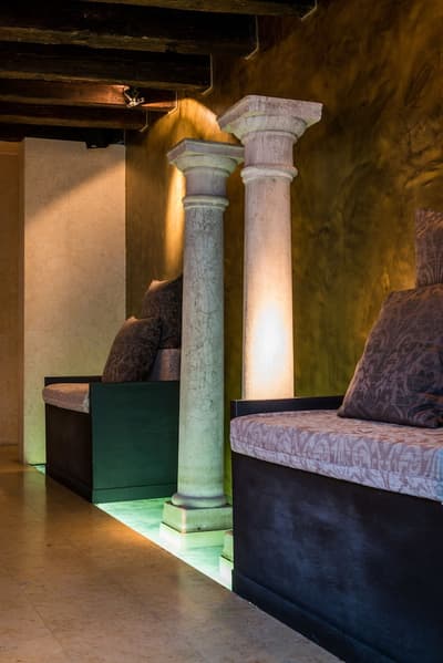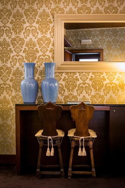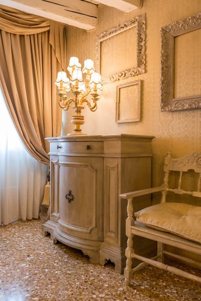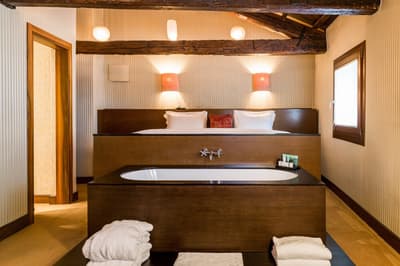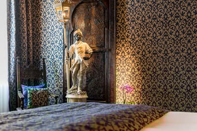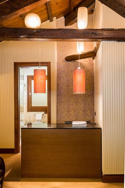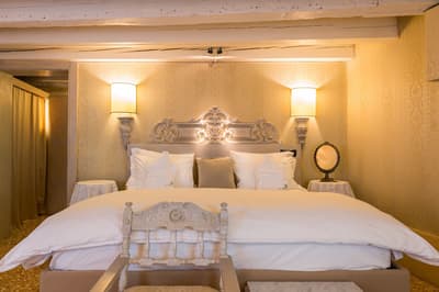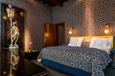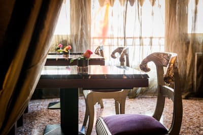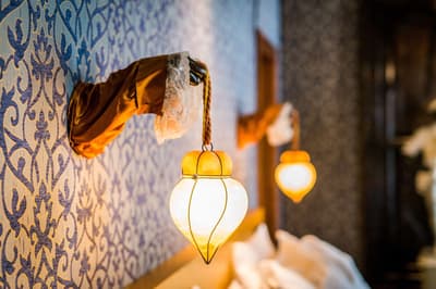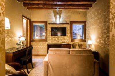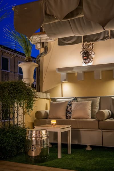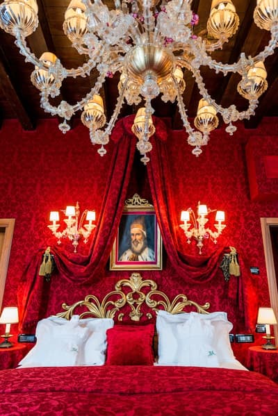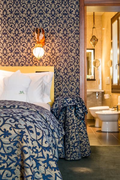 La Ca Maria Adele a tout d’un refuge secret. Si vous rêvez d’un séjour chic et intimiste à Venise, ne cherchez plus ! C’est un voyage dans le voyage que vous allez faire dans ce palais du 16ème élégant et discret d’extérieur. Le comble du luxe sera d’y débarquer côté canal où il a son ponton. Romantique, non ? L’intérieur de l’hôtel va vous dérouler l’histoire de Venise dans une étonnante et subtile ambiance, à la fois opulente et feutrée. Vous serez comme envoûté par les influences orientales que l’on trouve partout. Le toit terrasse va même jusqu’à vous transporter dans un riad marocain ! Banquettes couleur sable, tables basses, lanternes, visages sculptés de rois maures, bois exotique, tout y est ou presque.Mais ici, l’exception réside dans les chambres thématiques qui sont des univers à elles seules. La chambre des Doges est une merveille, presque délirante. Tout y est rouge, de la moquette aux rideaux en passant par les fauteuils d’époque et le couvre lit. Le contraste vient de la dorure que l’on retrouve sur le magnifique lustre en verre de Murano, la coiffeuse, le grand miroir et les petits anges qui l’encadrent. Et regardez ce portrait du doge au-dessus du lit ! Il vous accueille et vous protège le temps de votre passage dans sa ville.