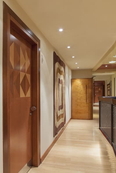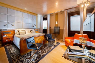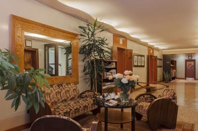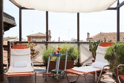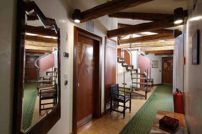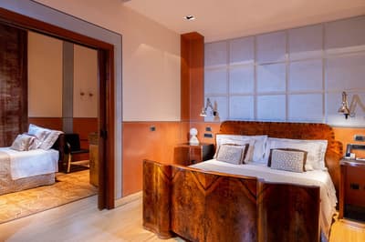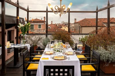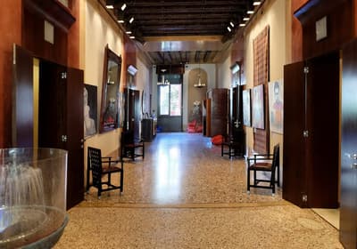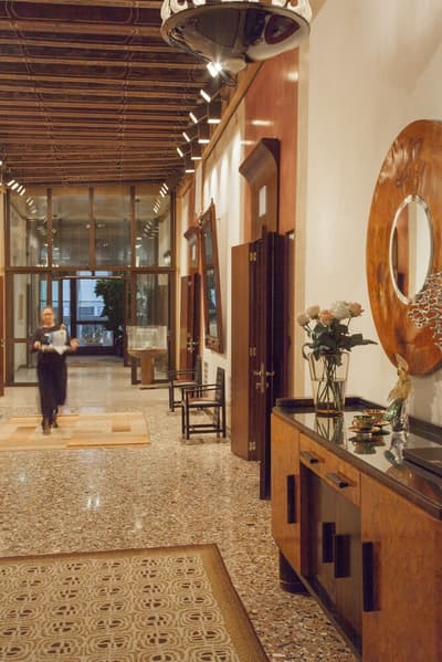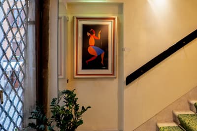 Les années folles vous inspirent ? Voilà qui tombe bien, la Ca’ Pisani vous replonge dans l’époque The Great Gatsby ! Si d’extérieur le palais est plutôt sage avec sa belle façade ocre, l’intérieur se pare d’un total look art déco. Pour vous en imprégner, il faut commencer par déambuler dans la longue galerie qui s’étire jusqu’à un buste de femme vêtue d’une robe de créateur. L’ambiance de fête et le faste sont bien là ! Le sol est en marbre, le mobilier ébène ou acajou, les grands miroirs ornent murs et mobilier, et les luminaires semblent flamboyer. Un peu plus loin, suivez les balustrades en fer forgé et admirez le sens du détail, avec ces élégants hippocampes nichés dans leurs écrins d’algues protectrices !La famille Serandrei, dont c’est ici la 4ème génération, a une passion, l’art, et une envie, la partager avec vous. Tout l’hôtel est décoré d’œuvres et de pièces uniques de la première moitié du XXème. L’ensemble est joyeux, coloré et vivant ! A l’entrée de la salle du restaurant, le tableau futuriste de Fortunato Depero est un vrai feu d’artifice, une explosion de couleurs et de formes en mouvement. Il se suffit presque à lui seul pour résumer l’esprit de la Ca’Pisani : créer la surprise, vous émerveiller et vous faire entrer dans la danse !