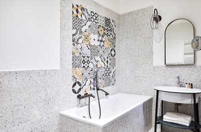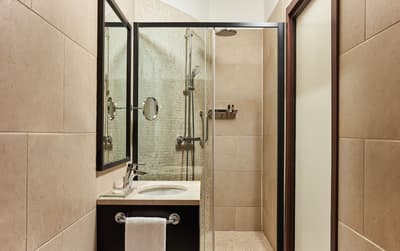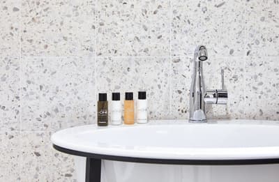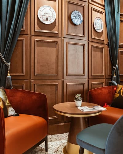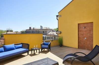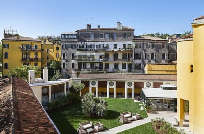 Incroyable, ce silence à Venise ? Pas tout à fait, puisque l’hôtel Indigo Venice Sant’Elena a pris ses quartiers dans un ancien monastère de 1930. Et qui dit monastère, dit aussi jardin intérieur, verdure, chant des oiseaux. Bref, l’atmosphère zen dont vous rêviez ! En prime, un lifting tout récent confié à des créateurs italiens a fait entrer le design au couvent. Mariage réussi, si on peut se permettre ! Le vaste espace accueil-salon-restaurant en est la pièce maîtresse : un vrai patchwork de tendances, pour un résultat d’une grande élégance. Les sols en marbre enchaînent les formes de motifs pour définir les espaces. D’abord la réception et son petit côté kitch, avec les comptoirs et les rideaux de velours bleus qui laissent entrevoir une collection de figurines et objets d’art vénitiens. Ensuite le petit salon tapissé de moulures en bois foncé, avec ses gros fauteuils en cuir rouge et leurs coussins imprimés de visages de doges. Enfin le très chic bar-resto, avec un comptoir rétro joliment mis en lumière et une longue banquette en cuir bleu et vague de tissu beige — devant laquelle s’aligne une brochette de tables au style bistro. N’oubliez pas de lever les yeux pour mater les superbes luminaires en verre blanc ou en couleur ! Ce sont de pures merveilles... Et au fond, la haute porte vitrée ouvre grand sur l’ancien cloître. Mais chut, prière de ne pas perturber la sérénité des lieux…