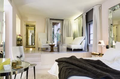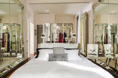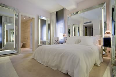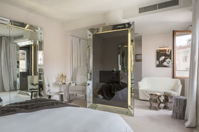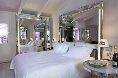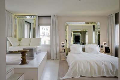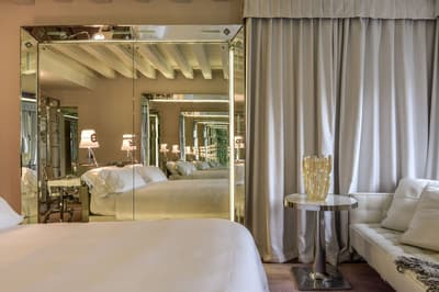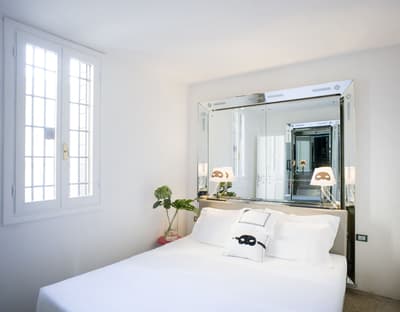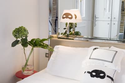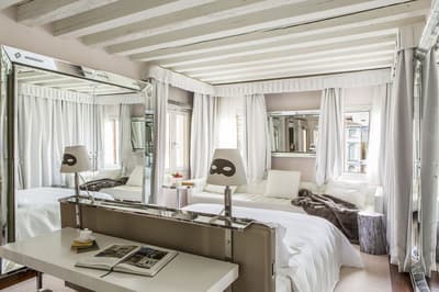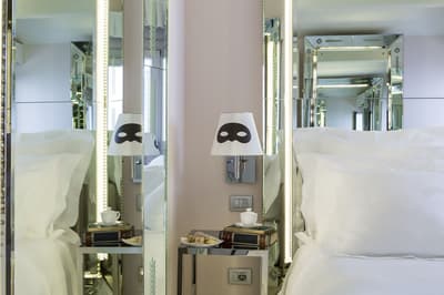 Le Palazzina Grassi est LE spot branché de Venise ! C’est l’adresse des soirées people pendant la Mostra. Le palais abrite un hôtel, un restaurant mais aussi un club. Son credo ? "The place to be"… Son logo ? Le masque noir ! Les lieux se veulent clairement tendance et glamour. Alors pour définir les contours de leur design, qui mieux que Philippe Starck ? Les chambres font penser à des showrooms, l’intimité en plus. Elles sont presque entièrement blanches, hyper lumineuses, avec des miroirs immenses partout. Et quand on dit partout, c’est vraiment partout ! Que ce soit habillant votre tête de lit, décorant les murs, servant de cloison, cachant le minibar, accompagnant votre verre en terrasse, et bien évidemment occupant toute la place dans la salle de bain. Avec tout ça, vous serez inévitablement tenté de jouer les mannequins quand il s’agira de choisir votre tenue pour la prochaine soirée ! Celle-ci ? Ou bien celle-là ? Chic en tout cas pour rejoindre votre table éclairée par des chandeliers entre les colonnes de marbre du restaurant. Ambiance feutrée en début de soirée et arrêt fortement conseillé au comptoir du bar pour une coupe de champagne sous les lustres design. Passé minuit, les meilleurs DJ prennent les choses en main, les masques tombent, la chaleur et le volume montent au club !