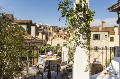 De sa terrasse aménagée de belles chaises, elle profite d’une vue merveilleuse sur les toits de Venise. Agréable et confortable, elle a tout le nécessaire pour un séjour serein. Elle accommode un grand lit et dispose d’un bureau dans un coin de la pièce. Salle de bain avec baignoire ou douche.