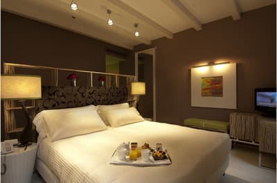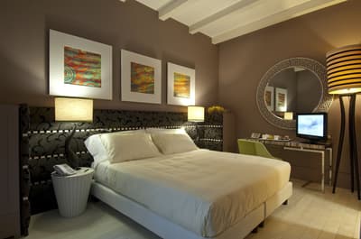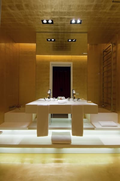 Impossible de se lasser du spectacle sur le Grand Canal qui se joue devant le Sina Centurion Palace ! Les 1ères loges sont bien ici, depuis la terrasse qui semble flotter sur l’eau ou derrière les immenses fenêtres. Si vous rêvez de grands espaces et d’ouverture sur Venise, ce palais gothique pourrait bien vous plaire. L’art et le design sont les maîtres à bord et la magie opère ! A chaque espace sa mise en scène, sa personnalité, sa teinte. Pourpre pour la chaleur au bar avec des banquettes en velours qui ondulent autour des tables basses coniques. Blanche pour l’élégance au restaurant avec des assiettes aussi belles que des tableaux. La bichromie va vous en faire voir de toutes les couleurs dans les chambres. Il y en a presque autant que de pièces ! Elles subliment à merveille les œuvres d’art. Vous serez surpris de voir comment l’aménagement des suites fusionne avec l’architecture originelle. Les combinaisons sont parfaitement réussies entre cloisons, mobilier contemporain, banquettes et fauteuils design. Tout est sur-mesure ! Au cœur du palais, un dernier lieu enchanteur va agir sur vous comme un aimant : la grande cour intérieure porte les traces de son histoire. Avec son rétro-éclairage à la tombée de la nuit, elle est sublime.