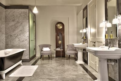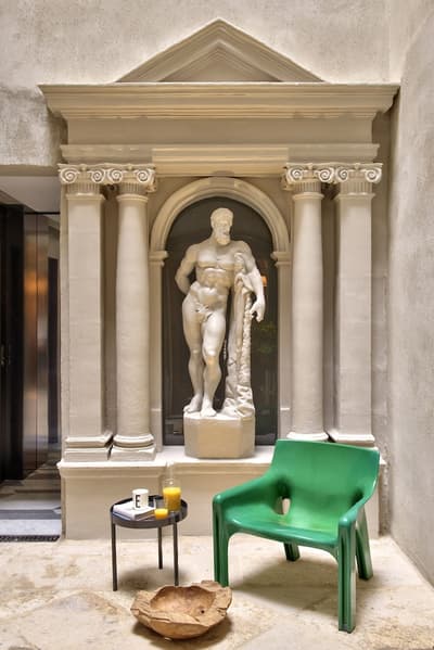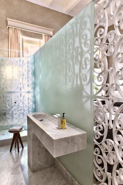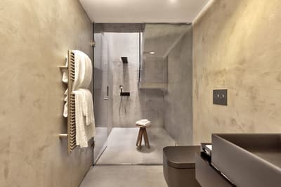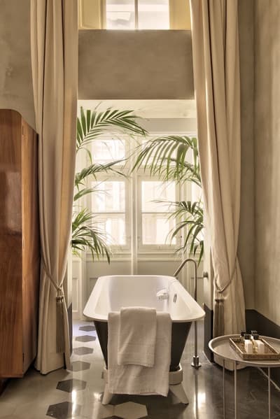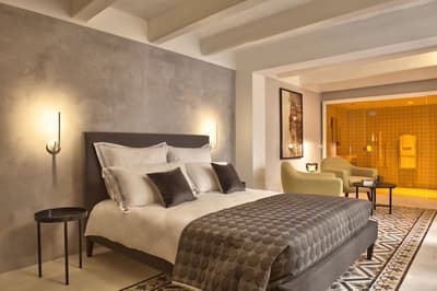 Élégante, elle comprend des murs finis avec un enduit à base de ciment, de hauts plafonds et bénéficie d’une luminosité naturelle. La chambre est dotée d’un lit king size avec un appui-tête en fer forgé de conception complexe, derrière lequel se trouve la cheminée traditionnelle d'origine, ainsi qu'un lavabo en marbre en porte-à-faux, conçu et fabriqué spécifiquement pour cette suite ; la forme a été sculptée dans un grand bloc de marbre bianco carrara. À noter que les installations de douche sont également judicieusement dissimulées derrière la cloison courbe vitrée en finition satinée, ce qui permet de préserver l'intimité tout en profitant de l'éclairage naturel de la pièce. Le tout dans une atmosphère cosy !