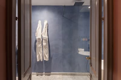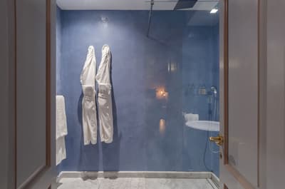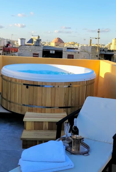 Absolument merveilleux ! La grande terrasse en rooftop est aménagée d’un jacuzzi et de longues chaises. Agréable et confortable, elle accommode un grand lit et dispose d’un coin salon meublé de beaux fauteuils. Salle de bain chic avec douche à effet de pluie.