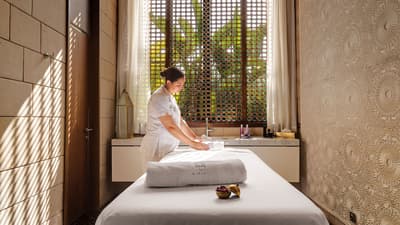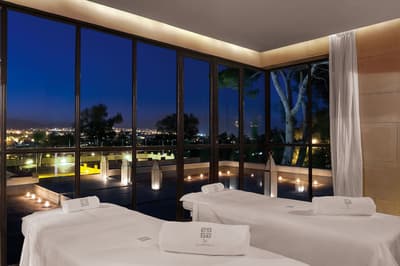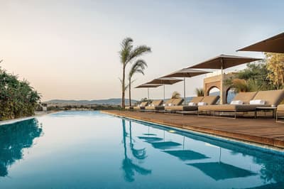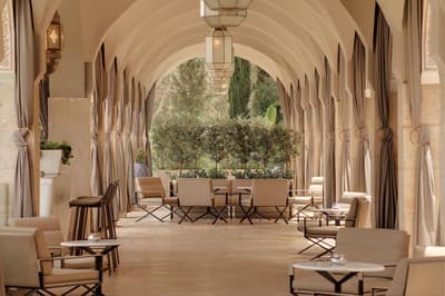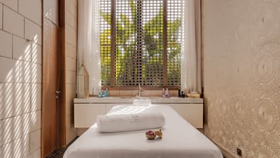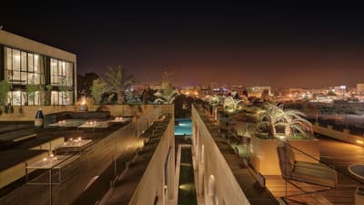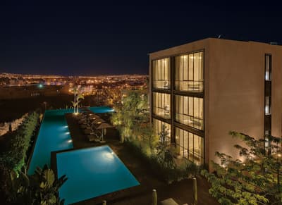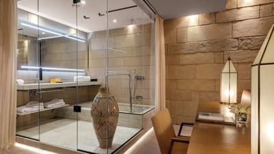 Aurait-on switché de ville ? Des murs de pierre blanche ponctués de baies vitrées, des lignes qui vont droit au but sans les arabesques habituelles, plus challenging que le Sahrai on ne fait pas à Fès ! Et ça matche ! Il faut dire que la famille propriétaire n'a pas lésiné pour construire ce palais et a fait appel à un architecte tout ce qu'il y a de plus pro, émule de Starck, excusez du peu ! Fans de déco, vous allez pouvoir vous faire un feed de ouf entre mobilier design sur fond de plâtre sculpté à la manière des moucharabiehs, jeux de lanternes et d'arcades et salles de bains vitrées comme des aquariums. Après des kilomètres dans l'effervescence de la médina et des visites où on s'en met plein les yeux côté zelliges et autres firoritures, cette épure est reposante pour les yeux mais aussi tous les sens. Tisser quelques brasses dans l'infinite pool, croquer des cornes de gazelle en sirotant un thé à la menthe dans un écrin de marbre ou boire un verre sur le rooftop, au coucher du soleil avec panorama sur la médina, on arrêterait bien le temps une bonne fois pour toutes au coucher du soleil. Enfin pas avant d'avoir trempé un doigt de pied dans la petite piscine du Spa : c'est l'un des quatre Spas Givenchy au monde !