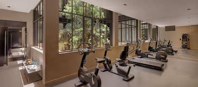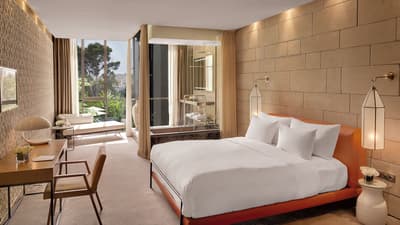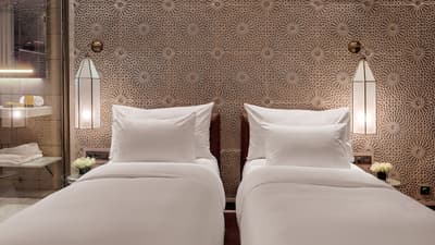 Salle de bain en marbre, WC séparé, Fenêtres du sol au plafond, Espace de travail, Climatisation, Coffre-fort pour ordinateur portable, Mini-bar, Machine à café Nespresso, Eau minérale, Téléphone, Télévision par satellite à écran plat, WIFI gratuit et Internet haut débit, Bienvenue pâtisseries marocaines maison, Articles de toilette Acqua di Parma, Sèche-cheveux, Peignoirs et pantoufles.