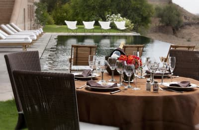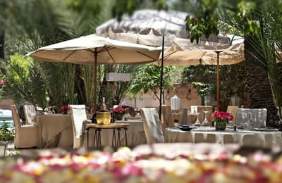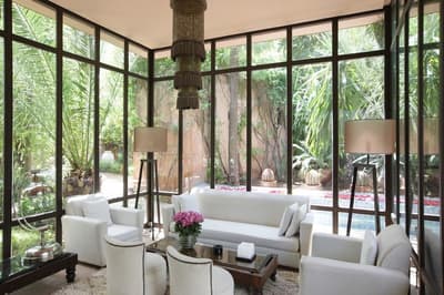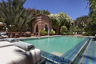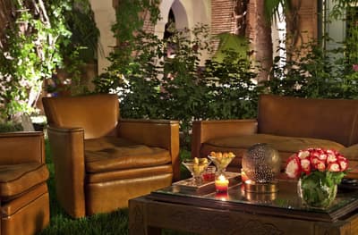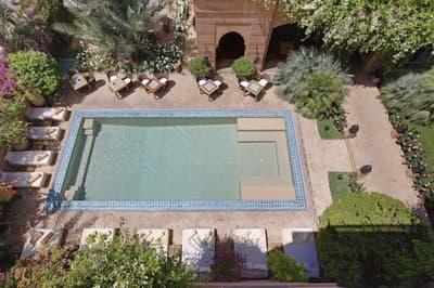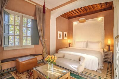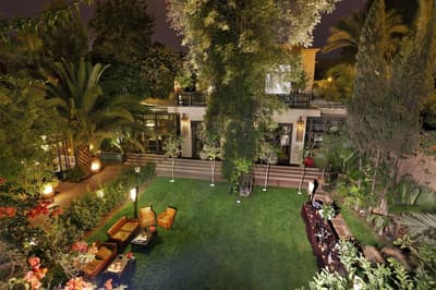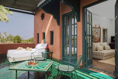 On ne peut rêver mieux pour s'immerger dans la douceur de vivre de Marrakech : entre cascades de bougainvillers, palmiers et une débauche de vert que ne renierait pas le jardin Majorelle, vous voici transportés en plein coeur de la ville-jardin ! Le green est l'essence-même de la ville Rouge, on pourrait dire "les sens", vous allez le vérifier dans ce palais d'hôtes tout en terrasses et alcôves librement ouvertes sur les parfums, jasmin ou fleur d'oranger. De quoi vous faire tourner la tête, non ? Surtout quand vous aurez fait le tour du proprio, de salons cosy métissant art déco et zelliges, en terrasse bleu Majorelle et bassins festonnés de papyrus. Et on ne vous parle même pas des petits plats de la cheffe qui s'amuse à twister la tradition, en piochant épices et saveurs d'ici et d'ailleurs. Le soir venu, quand les lueurs des bougies se reflètent dans la verrière du restaurant Mimouna, le voyage c'est dans l'assiette ! Ca tombe bien, on a toute la journée pour buller. Soleil ou ombre ? On mixe, après la chaleur d'un bed au bord de la piscine, on se replie à la fraîche dans l'un des salons avant de se réchauffer au hammam, et l'hiver auprès du feu de cheminée !