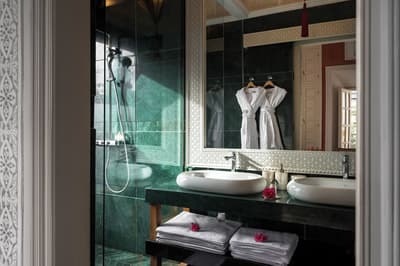 Cette belle suite est spacieuse et agréable avec 2 chambres. C’est l’idéale pour une famille. Entourée par le jardin luxuriant, elle baigne dans une atmosphère relaxante. Le salon est très convivial et relie les 2 chambres dans un espace commun accommodé de fauteuils confortables. C’est le top pour un séjour authentique. Salle de bain chic avec toilettes et salle de bain séparées.