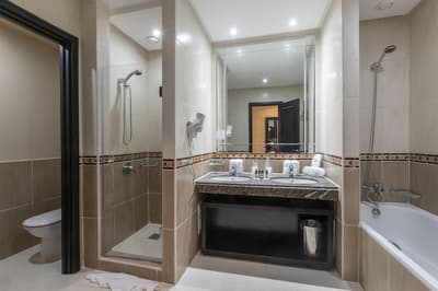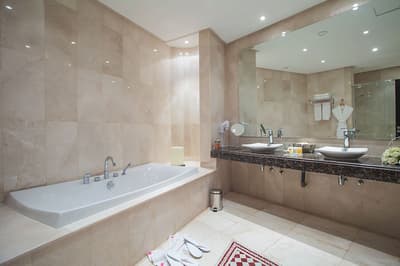 Spacieuse, elle est agréable et très confortable. Elle dispose d’un grand balcon avec une belle vue sur l’esplanade. Son espace extérieur est aménagé de longues chaises pour apprécier le cadre merveilleux. Elle profite d’un coin salon avec de belles banquettes. Salle de bain chic avec baignoire et 2 vasques.