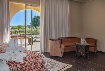 Située à proximité de la piscine, cette belle suite familiale y offre un accès direct et privilégier. Elle est conçue pour accommoder toute une famille avec 1 grand lit et une alcôve. Elle procure intimité tout en étant néanmoins conviviale. Sa terrasse ou son balcon complètement aménagé est idéal pour apprécier le cadre merveilleux. Elle dispose d’un coin salon avec de belles banquettes. Salle de bain chic avec baignoire et 2 vasques.
