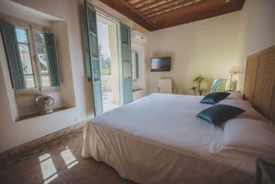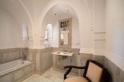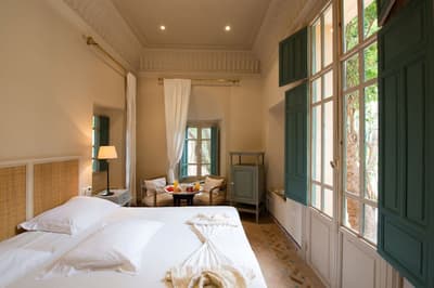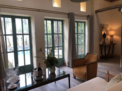 Agréable et confortable, la belle suite junior profite d’un espace calme et serein. Elle s’ouvre sur les jardins ou sur la cour intérieure. C’est l’idéale pour se relaxer. Petit coin salon avec des fauteuils confortables. Salle de bain d'un style typique.
