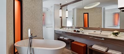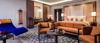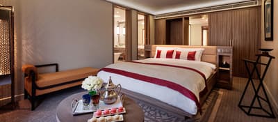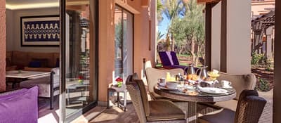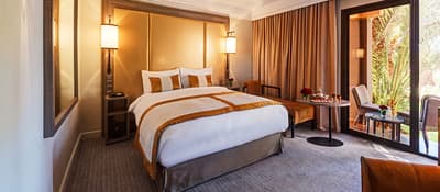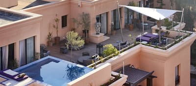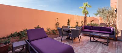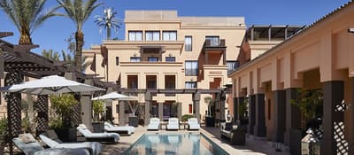 Si le nom d’Ahmed Al Mansour Eddahbi ne vous dit rien, un séjour dans cet hôtel de la chaîne Mövenpick viendra éclairer votre lanterne : il s’agit d’un sultan de la dynastie saâdienne, à qui le Maroc doit son essor culturel au XVIe siècle. Respect ! Récemment, les Français Marc Hentricht et Nicolas Adnet, qui ont par ailleurs décoré plusieurs Club Med et Sofitel, se sont inspirés de son héritage pour rénover les sept bâtisses qui portent le nom de ses fils : Mehdi, Zidane… (toute ressemblance avec une personnalité actuelle étant évidemment fortuite). L’ensemble est sophistiqué, opulent, glamour, mais jamais too much. Il suffit pour s’en convaincre de faire le tour du propriétaire : se balader sous les palmiers et les oliviers, visiter la galerie d’art, flâner dans les salons dorés et feutrés, se détendre au spa griffé Cinq Mondes, faire le plein d’ondes positives au studio de yoga, déjeuner au milieu des portraits du street artiste résident Hicham Bellaghzal, s’offrir un cocktail sur le rooftop et jouer soi-même les sultans dans l’incroyable Penthouse de 290m² avec ses trois chambres, sa terrasse et sa piscine privée. Pour mettre des paillettes dans sa vie, on n’a pas trouvé mieux.