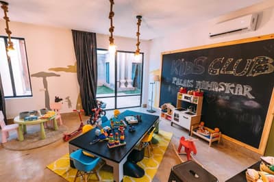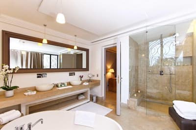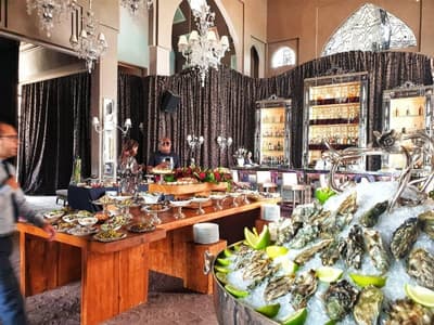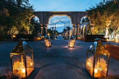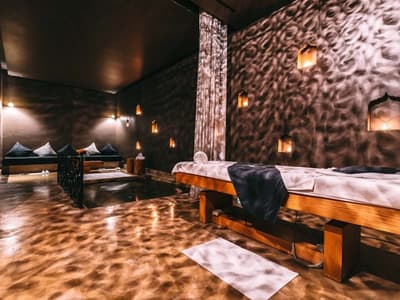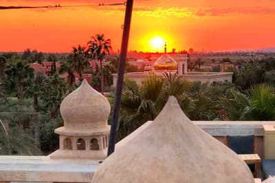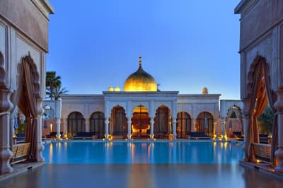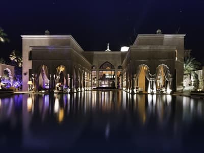 Des coupoles dorées qui se découpent sur fond de ciel bleu, des arcades dentelées qui courent le long de bassins interminables… Attendez-vous à être bluffé en arrivant au Palais Namaskar ! Cet hôtel compile tous les superlatifs. Vous êtes au coeur de la palmeraie de Marrakech et pourtant, êtes-vous seulement au Maroc ? Pas uniquement. S'il y a bel et bien du mauresque et de l’andalou dans cette architecture aux dimensions XXL, il y a aussi de l'Inde et de la Chine. L’ensemble en effet, a été conçu selon les principes du Feng Shui. "Énergie, pureté et équilibre" ont guidé toutes les étapes de construction. Le mauvais œil n’a qu’à bien se tenir ! On ne voit d’ailleurs pas très bien ce qu’il viendrait faire ici, où tout n’est que luxe et volupté. Trop ? On reste parfois songeur devant les collections de lustres de Murano et les kilomètres de marbre de Carrare ou de rideaux - il y en aurait sept au total ! -, reprenant à l’infini les motifs des tapis. Mais étonnamment, le tout reste sobre, dans le ton d’un lieu vraiment au top pour se ressourcer. Entre une séance au Spa Namaskar et un cours de yoga, vous vous calerez dans un hamac au bord de la piscine, avec un bon bouquin. Vous pourrez aussi vous la jouer perso, posé dans votre suite ou dans votre villa. Un bassin ou une piscine privée pour barboter, ça ne se refuse pas ! Enfin, vous ne manquerez sous aucun prétexte l’apéro sur le rooftop, au coucher du soleil. Le panorama sur l’Atlas et les collines des Djebilet est juste à tomber ! Et vu du ciel, à bord d'une montgolfière, c'est encore plus magique...