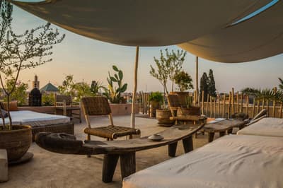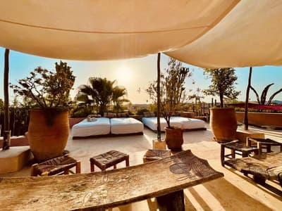 Vous voulez vivre une expérience magique ? Au détour de ruelles typiques, poussez la porte du Riad 144 ! A quelques mètres des souks de la Médina et de la mosquée Koutoubia, cet hôtel de 8 chambres est réparti sur deux riads adjacents. Loin de l’effervescence de la place Jemaa el-Fna, l’endroit est calme et apaisant. L’accueil est incroyablement bienveillant. Comme si vous arriviez chez des amis pour un séjour d’agrément. Côté déco, les propriétaires ont réussi un véritable tour de force. Le lieu est superbe sans être show off ! Un style oriental épuré, des coins et des recoins joliment aménagés, un mix subtil entre tradition marocaine et modernité. Les deux riads permettent de doubler les espaces : deux patios, deux salons et de nombreuses terrasses. L’établissement est le plus haut du quartier, et la vue à 360° du rooftop panoramique est tout simplement à tomber ! Topissime pour y prendre le petit-déjeuner entouré de plantes aux senteurs parfumées. Ou encore admirer le coucher du soleil. Les patios sont une invitation au farniente. Le premier vous propose de paresser à l’ombre des palmiers. Le second a un look de jardin luxuriant agrémenté d’une fontaine. La petite piscine est bienvenue pour vous rafraîchir. Pour 100 % de sérénité, à vous les rituels traditionnels de beauté. Le riad propose massages et hammam privé. Il y a même une petite salle de fitness. Bon plan pour éliminer les calories car la cuisine est irrésistible !