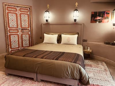 Chaleureuse, l’ensemble présente du stuc ou de la sculpture sur bois et une finition en plâtre de tadelakt avec des accents de couleur rouges. Une double porte marocaine très ancienne sépare la chambre du petit salon, et celui-ci bénéficie d’une cheminée privée pour les soirées hivernales en amoureux. Elle comprend un lit King size ou deux lits simples et la salle de bains est bien équipée avec une douche séparée. Le tout dans une ambiance chaleureuse et paisible !