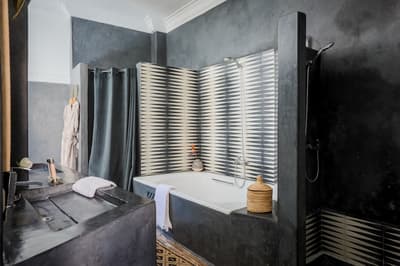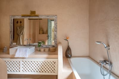 Décorée dans un style Marocain, elle comprend un grand lit double confortable avec un mobilier marocain et se complète dans des teintes terracotta. La salle de bains privée est élégamment décorée et dispose d’une baignoire ou douche et d’articles de toilette gratuits. Une atmosphère sereine et chic à la fois !
