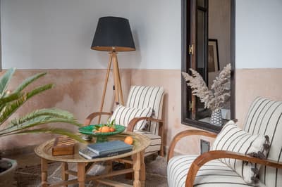 Située au rez-de-chaussée, cette jolie chambre donne sur le patio central et jouit du salon extérieur attenant. À noter qu’elle ne peut pas accueillir de lit supplémentaire et est non-fumeur.