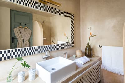 Le décor est minimaliste et moderne avec un mobilier marocain, un grand lit double confortable et l’ensemble se complète dans des teintes ocres, écru et terracotta. La salle de bains privative est peinte d’un joli bleu et dispose de toilettes et d’une douche. Une atmosphère sereine et chic à la fois !