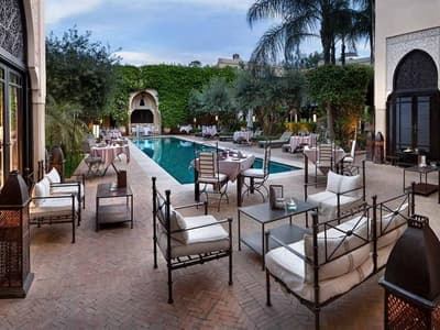 Déco raffinée de palais arabo-andalou, espaces et atmosphères intimistes, service, gastronomie, confort et équipements de compétition pour la détente et le bien-être avec 2 piscines et un Spa, une adresse de charme pour vivre Marrakech entre deux siècles.