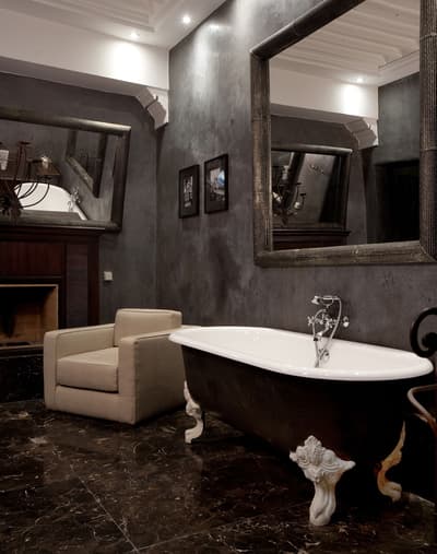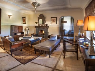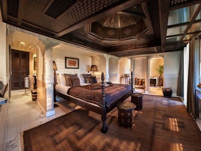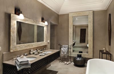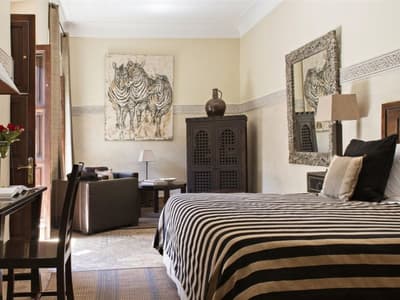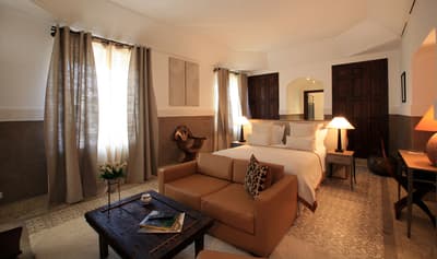 Installée au 1e étage, elle profite de différentes vues dépendant de sa position. Elle offre un accès direct et privilégié au balcon aménagé de longues chaises pour apprécier la vue époustouflante sur l’Atlas, la Koutoubia ou la Médina. Petit coin salon avec de beaux fauteuils confortables. Salle de bain chic avec doubles vasques.