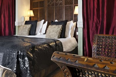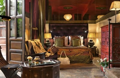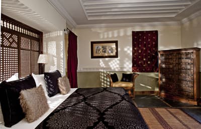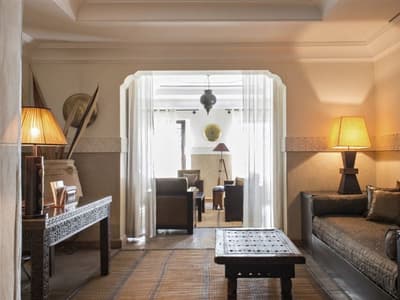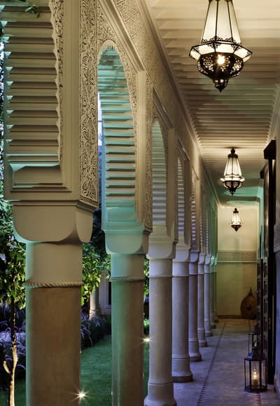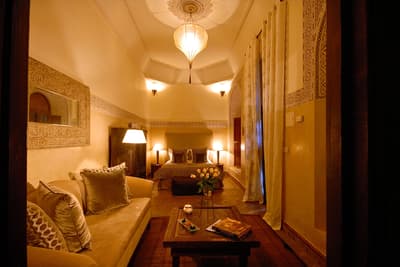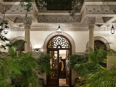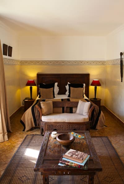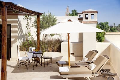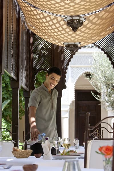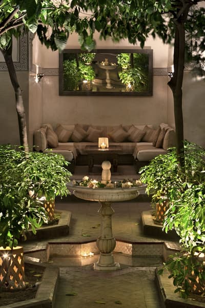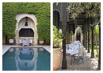 Tout y est ! Les arcades en plâtre ciselé, les portes en bois sculpté, les patios arborés (avec des orangers évidemment !) où murmurent les fontaines, les tissus et voilages précieux… Dans cette ancienne demeure de notable des années 1930, on vous sert l'art de vivre marocain sur un plateau. A deux, on y est seuls au monde ! Avec ses trois patios et sa collection de salons feutrés comme un club anglais, les espaces se prêtent aux tête-à-tête, que l'on pourra customiser selon les heures de la journée, en mood farniente au soleil avec en-cas méditerranéens au bord de l'une des deux piscines, thé à la menthe et cornes de gazelle l'après-midi ou gastronomique avec dîner fin à la lueur des bougies. Sans parler des suites avec terrasse ou du riad privé avec piscine. Au coucher de soleil, on se poste sur la terrasse où trône la 2e piscine : cascades de bougainvillers, Koutoubia et panorama sur l'Atlas, vous avez dit idyllique ? C'est aussi l'heure de tester les cocktails au tout nouveau bar branché mixologie. Bref, difficile de sortir de cette oasis où tout vous incite à cocooner, y compris le Spa estampillé Nuxe et son hammam digne des thermes antiques. Mais il suffit de pousser la porte et de demander conseil : la médina est à la porte !