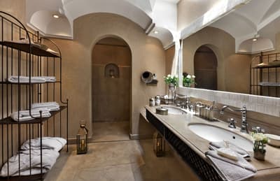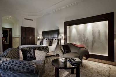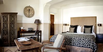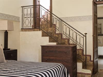 Cette belle suite en duplex, procure espace et de confort. Elle profite d’une vue et d’un accès direct sur la cour intérieure principale et sur la fontaine et ses orangers. Elle baigne dans une atmosphère paisible et très calme. Accommoder d’un lit double et d’un lit simple, elle est idéale pour 3 personnes. Vrai salon avec des fauteuils confortables. Salle de bain chic avec doubles vasques.