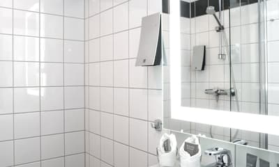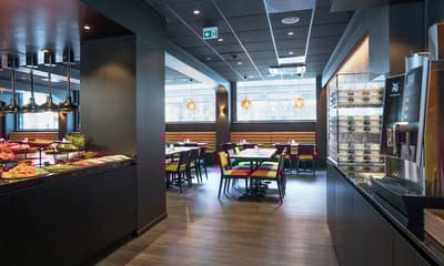 Le sage quadrilatère de brique rouille cache bien son jeu... À l'intérieur, c'est l'explosion de teintes funky ! Couleurs primaires et imprimés tout droit sortis des années 80-90, velours, cuir et tutti quanti. Bref, Andy Warhol n'aurait pas fait mieux. Si vous avez les yeux sensibles, gardez alors vos lunettes de soleil ! Sans doute une volonté d'apporter de la chaleur aux longs hivers blancs frappant chaque année sous cette latitude. Assortis au décor, vous serez accueillis par un.e réceptionniste à cravate rose flashy, sur un arrière-plan cosmique. Et si l'hôtel est plus destiné à un public business ou bleisure, son style efficace et son emplacement de choix en fait aussi une bonne base pour explorer la capitale. Les habitués des hôtels Thon y retrouveront leurs repères, ceux de tous les hôtels de la chaîne, de Bruxelles à Oslo en passant par Rotterdam. C'est le concept fondateur de Thon. Lorsque Olav Thon a fondé Rainbow Hotels en 1989, son business model consistait à établir des hôtels de standing, proche du centre-ville, tout en proposant des tarifs compétitifs. Dommage, le mot "Rainbow" a depuis disparu du nom. Heureusement, l'idée, elle, s'est clairement fondue dans le décor !