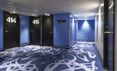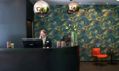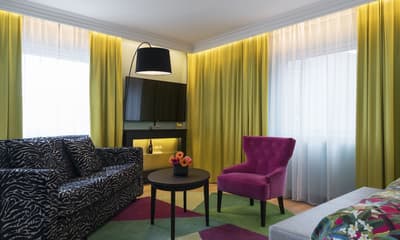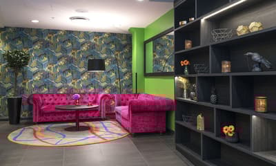 Terminus, tout le monde descend ! Et voici le moment tant attendu de faire votre check-in à l'hôtel. La façade jaune géométrique semble presque construite en briques Duplo. Elle abrite un monde en technicolor, avec des canapés en velours capitonnés rose fushia ou bleu des mers du sud. Et quand les murs de sont pas vert fluo, ils déclinent des imprimés aux couleurs tout aussi funky, et des motifs du genre à construire des images en 3D, en louchant un peu. Votre orthoptiste va être content ! L'hôtel assume totalement son look arlequin en exposant une photo de l'île de Burano, connue pour ses maisons aux couleurs vives. Quant au mobilier, il s'accorde à merveille avec ce style rococo bling-bling. Mais plus vous monterez les étages, plus la tendance sera à l'assagissement. Certaines chambres sous les toits arborent un style plus apaisé. En tout cas moins dans le contraste et la provocation oculaire. D'un blanc presque décevant, les salles de bain semble avoir été oubliées par les peintres. « Une pause s'impose », se sont-ils dit ! De même pour la salle du buffet, où la série de lustres arrondis et dorés, pendant du toit vitré, attire toute l'attention. Enfin ça c'est avant d’entamer le petit-déj' de champion !!