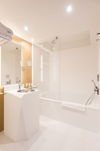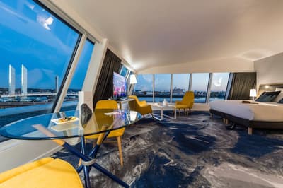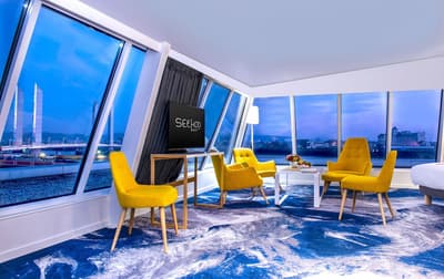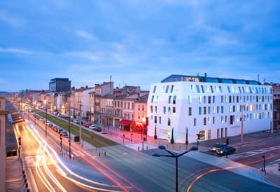 Il était une fois, sur les bords du fleuve Garonne, un colosse, un édifice géant à mi-chemin entre un iceberg et un bateau de croisière, se dressant fièrement et toisant le pont Chaban-Delmas. Ce mastodonte de glace (en vrai, sa façade est recouverte de Corian qui lui donne cette teinte rosée toute poétique au coucher du soleil), on l'appelait Seek'Oo ! Vous vous sentez d'un coup plongé au cœur d'une odyssée ? Dans le récit d'un roman d'aventure dont l'histoire se déroulerait dans le Grand Nord ? Et bien Seek'Oo c'est un peu tout ça mine de rien. Bon, à la différence près qu'une fois dans votre chambre (parce que le Seek'Oo, c'est un hôtel), le voyage sera plus sédentaire qu'une aventure dans le Grand Nord. Seek'Oo, c'est donc un hôtel 4 étoiles contemporain et design, au style graphique et aux lignes épurées, implanté sur les quais de la Garonne, au cœur de ce quartier en pleine restructuration. Et si vous voulez parfaire votre culture eskimaude, sachez que Seek'Oo, c'est en référence au mot inuit « siku », désignant la glace. Moderne il l'est donc, incontestablement, mais Seek'Oo a su conserver une taille et un esprit que ses concepteurs ont voulu humains. C'est pourquoi, sous ses allures de titan givré, le Seek'Oo n'est en fait qu'un géant de papier. Enfin vous l'aurez compris, il est grand, il est beau, il est chic et design, mais il est avant tout convivial et chaleureux. Super équipé aussi !