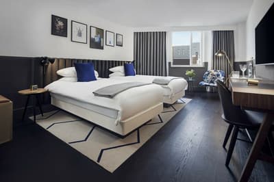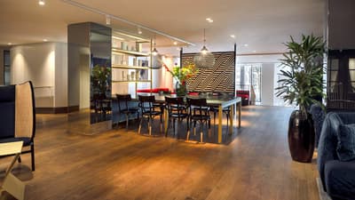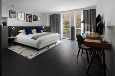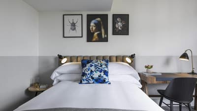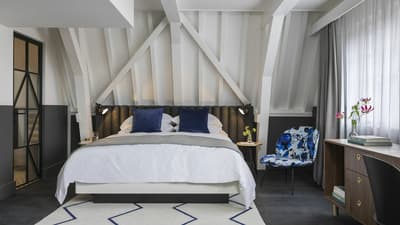 "And breathe" ! C’est ce qu’on peut lire en rose flashy sur la façade végétalisée du Kimpton De Witt. Respirer certes ! Mais le contraste entre l’architecture extérieure du XVIIème siècle et le design intérieur est à couper le souffle. Et c’est sans parler de la réhabilitation de cette construction des années 80, intégrée elle aussi à l’hôtel, dont vous trouverez les stigmates au restaurant Celia… Quand vous verrez au plafond ces gros tuyaux et aux murs ce carrelage façon laboratoire, vous serez tout aussi surpris, d’autant plus que le parquet à chevrons, les banquettes en cuir moutarde et le comptoir en bois mélangent encore les styles. Le Super Lyan bar est le cœur névralgique du Kimpton. Pour cause, la déco est carrément sexy. Attendez-vous à faire un saut dans les années 60 ! Le mobilier, les néons, les couleurs, tout évoque les American diners. L’éclair, emblème du Super Lyan, s’invite partout, jusque sur la mousse de vos cocktails ! L’éclair de génie en revanche, c’est d’avoir conservé ces poutres et charpente apparentes dans les suites ou encore dans The Little House, dans les parties anciennes. Avec sa terrasse panoramique, son escalier en colimaçon et sa cheminée, la Penthouse De Witt vous laissera échapper un dernier waouh…