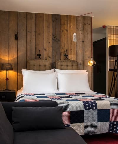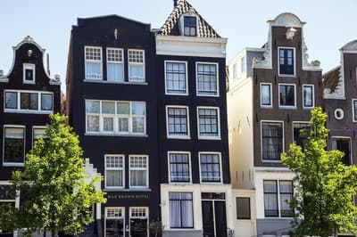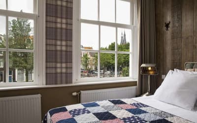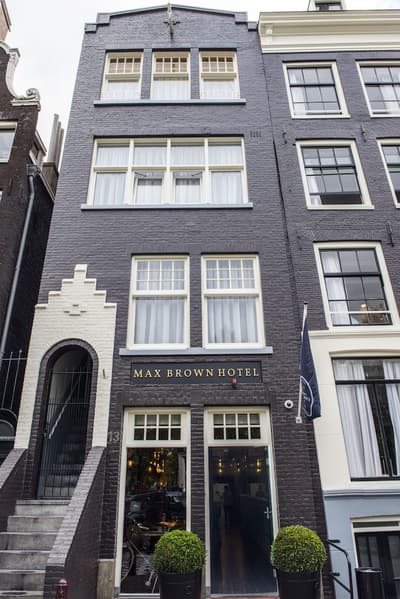 Envie de vous immerger dans le charme particulier de la capitale néerlandaise ? Le Max Brown Canal District coche toutes les cases d’un Amsterdam de carte postale. Ce petit Boutique Hotel stylé est niché dans le quartier central de Jordaan, à l’ambiance bohême et vintage branché. Vous êtes au cœur des canaux, environné de ponts et de maisons à l’architecture typique. L’hôtel occupe d’ailleurs trois de ces maisons historiques construites tout en hauteur. Les façades des bâtiments ont plus de 300 ans. Mais à l’intérieur, le style est radicalement différent. Vous êtes accueilli dans une ambiance cosy et un décor résolument trendy. Un design soigné qui mélange contemporain, indus et rétro raffiné. Dès l’entrée, un mur recouvert de livres donne un ton décalé. En face du bar, les dessins ludiques d’un street artist local s’affichent en mode épuré. Le lounge n’est pas grand mais les canapés profonds et la cheminée vous donnent envie de vous installer. L’endroit est nickel pour prendre un café ou bouquiner. En plus, une bibliothèque est posée juste à côté. Le bar s’anime en fin de journée. Happy hour dès 17h avec bières locales et cocktails à siroter à l’intérieur ou sur la terrasse aménagée. Pour accéder aux chambres, mieux vaut ne pas être chargé. Les escaliers sont typiques des maisons d’autrefois : plutôt raides et étroits. Pour avoir l’impression de dormir dans un houseboat local, demandez une chambre avec vue sur le canal !