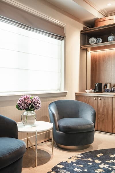 Dans un style de décoration contemporaine, elle présente un mélange unique d'éléments d'art historique et de design moderne provenant de la collection privée du 717. La chambre est dotée d’un lit king Loro Piana et de lits superposés inspirés du super yacht. La salle de bains est équipée d’une douche pluie walk-in. Ambiance conviviale !