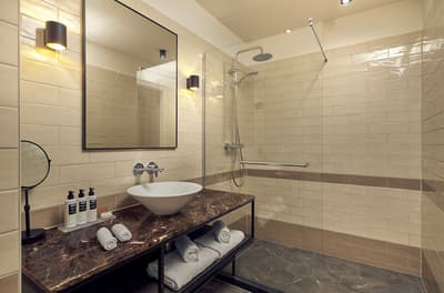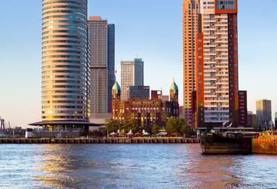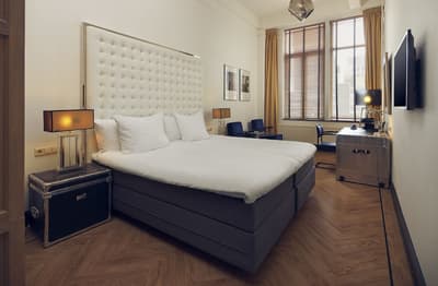 Bien plus qu’un hôtel, le New York est un morceau d’histoire ! Situé dans le quartier des docks de Kop van Zuid, il occupe une des constructions les plus iconiques du centre-ville. L’ancien siège de la Holland America Line, la compagnie maritime qui transporta des milliers d’émigrants de Rotterdam à New York. Construit en 1901, ce bâtiment mythique a conservé des caractéristiques architecturales typiques, proches de l’Art nouveau. Vu de l’extérieur, le contraste est frappant avec les buildings ultra modernes qui l’entourent. Une fois à l’intérieur, l’endroit est une véritable machine à remonter le temps ! Dès le hall d’accueil, vous ressentez toutes les vibrations d’un vrai lieu de mémoire. Un escalier d’époque avec sa balustrade en fer forgé, des murs lambrissés, des horloges au charme suranné et des lumières ambrées. Il y a même un ascenseur d’origine — claustrophobes s’abstenir ! Le café-restaurant du rez-de-chaussée occupe un immense espace décloisonné. Le look indus des piliers et des plafonds nus se mélange à la déco maritime. Un cadre lumineux qui donne sur la zone portuaire. Par beau temps, la terrasse est top pour voir les bateaux passer ou même admirer le coucher du soleil. Au sous-sol, un resto-bar plus cosy vous propose de faire une pause, entre banquettes capitonnées et ambiance branchée. A défaut d’embarquer vers les Etats-Unis, sautez dans un bateau-taxi ! Ils sont juste au pied de l’hôtel.