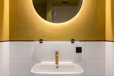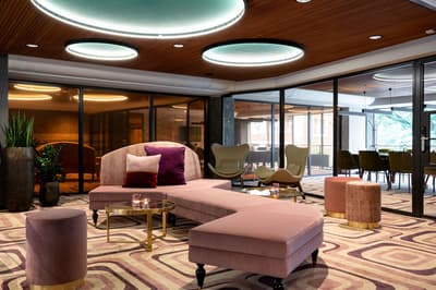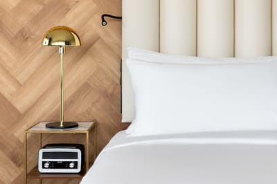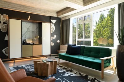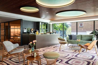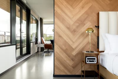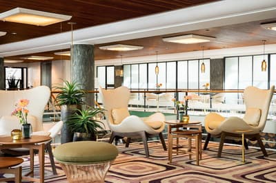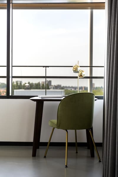 Envie de vous la jouer façon « Mad Men » dans un décor très fifties ? Bienvenue au Slaak ! Ce boutique hôtel est aussi emblématique du patrimoine historique de la ville. Siège d’un journal local, le bâtiment d’origine a été bombardé en 1940. Erigé sur les vestiges de l’ancien, le building actuel témoigne de la reconstruction de Rotterdam dans les années 50. La façade aux lignes épurées et aux immenses fenêtres peut vous sembler un peu froide. Mais dès que vous passez la porte, l’ambiance rétro sophistiquée est nettement plus cosy. Le lobby est très vaste avec des colonnes carrelées et des canapés design installés sous des grappes lumineuses en laiton. Un escalier monumental dessert une mezzanine très stylée. De part et d’autre de cet espace décloisonné, vous trouvez le bar et le restaurant Didot34, en référence à la police de caractère du journal. Le restaurant est très élégant avec sa cuisine ouverte et ses banquettes incurvées. La palette de verts et de jaunes se mélange aux tables en bois et aux motifs vintage du carrelage. Le bar est carrément raffiné avec son comptoir en bronze, ses canapés aux couleurs poudrées et ses tabourets aux armatures dorées. Vous voulez siroter un cocktail en toute tranquillité ? Installez-vous sur la jolie terrasse aménagée ! L’esprit 50s se poursuit dans les chambres avec tourne-disque et machine à écrire d’époque. Par contre, côté fitness, soyez rassuré. La salle de sport est ultra moderne !