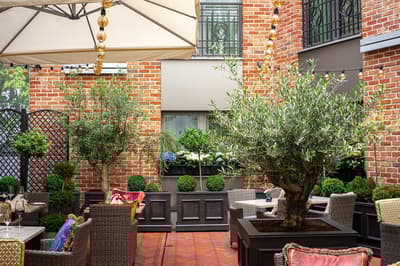 Tous les autres hôtels peuvent aller se rhabiller ! Là, on est carrément face à un palais. Par où commencer ? On ne sait même pas où donner de la tête, sérieusement. Ces lustres, ces nappes blanches, ces grands fauteuils… Vous aussi, vous commencez déjà à agiter votre main comme la reine d’Angleterre ? Ouf, on n’est pas les seuls ! On ne s’en est même pas rendu compte, on l’a vu dans le miroir doré de la salle de bains. Cette dernière est en marbre, s’il fallait encore le préciser, au cas où ce n’était pas évident. De toute façon, comme les salles de bains, tout est ultra-lumineux, dans les tons dorés. Tout, partout, c’est dingue ! A part les bars, où vous passerez, on l’espère, beaucoup de temps. A l’intérieur, c’est ambiance speakeasy cosy avec des canapés en cuir marron ultra-vintage. A l’extérieur, c’est plus chill avec murs de briques rouges, guirlandes lumineuses et petits fauteuils. Mais alors… le spa ! Lui, il est aussi lumineux que brillant, et surtout, quasiment entièrement doré. Ça brille de mille feux, de la piscine au sauna. Et vous savez quoi ? Vous ne vous en lasserez jamais, vous en redemanderez, même, forcément !