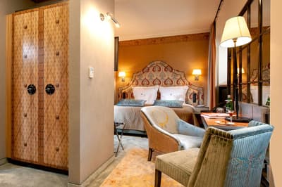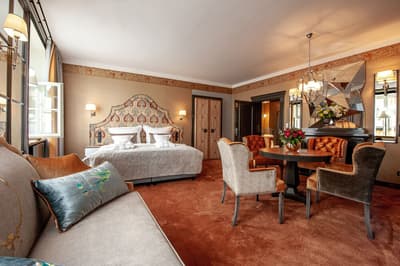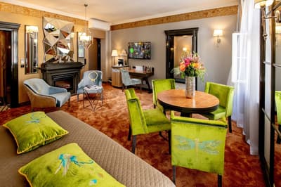 Elle bénéficie d’une décoration mêlant le moderne et le classique avec une belle moquette, des meubles capitonnés verts clairs, bleus roi et se complète par des luminaires design. La chambre est dotée d’un grand lit de 180 x 200 cm et dans deux d'entre elles, sur demande, le lit peut diviser et l’espace converti en chambres jumelles avec deux lits simples de 90 x 200 cm. La salle de bains avec plancher chauffant est équipée d’une douche. Le tout dans une atmosphère relaxante !
