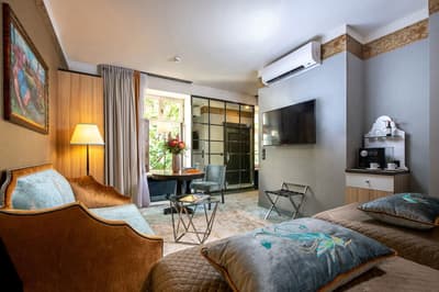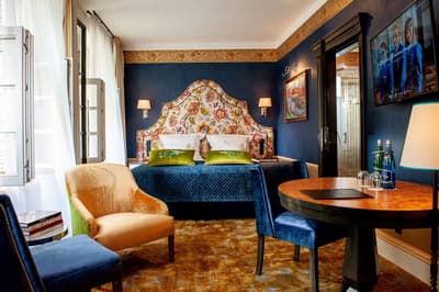 Ah ouais, OK, il n’a pas menti : c’est vraiment un design hotel ! Si vous avez l’impression de ne pas être dans votre état normal, ne vous en faites pas, personne n’a rien glissé dans votre verre… c’est juste l’hôtel qui est comme ça ! Ces fresques immersives d’arbres qui envahissent les murs du lobby, ce sol en marbre géométrique (aïe, ça vous rappelle les maths du collège ?) et ces figurines de moutons verts sur leurs tapis ressemblant à des nuages : tout ça, ce n'est pas le fruit de votre imagination, promis ! Vous recroiserez même leurs petits cousins un peu partout dans l’hôtel, pile quand vous oublierez un peu la folie de ce fameux Balthazar. Mais comment l’oublier ? Dans les chambres, c’est pareil, en version un peu plus royale, mais tout aussi haute en couleurs. On espère que vous aimez le vert et le bleu car cet hôtel tout beau, tout neuf en recèle dans tous les coins ! N’hésitez pas à passer le mot à David Lynch, si jamais il veut aller tourner son prochain film là-bas ! A côté de ça, Lost Highway, c’était une comédie romantique sans saveur. Il n’y a qu’un hôtel de ce type à Cracovie, ça c’est sûr ! Et il est magnifique à tous les étages, sans mauvais jeu de mot.