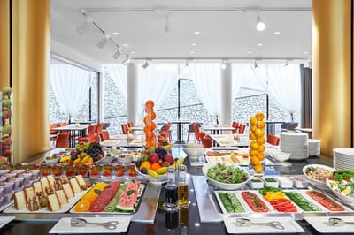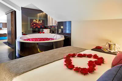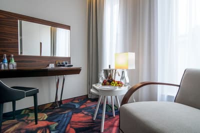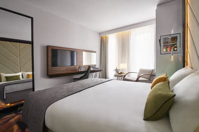 Télévision à écran plat, Chaînes câblées, Climatisation, Coffre-fort, Bureau, Sèche-cheveux, Set de cosmétiques, Minibar, Préparation du café ou du thé, Fauteuil, Peignoir, Kit cosmétique, Chaussons.