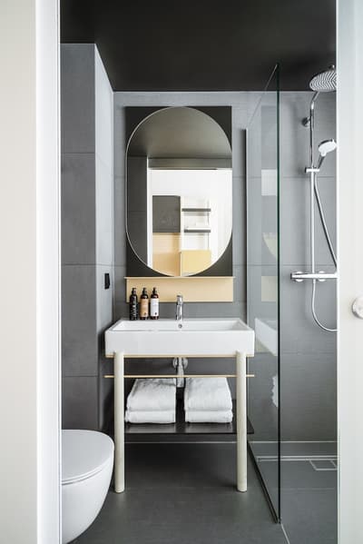 L’ensemble est dans un style moderne et soigné avec une belle moquette au sol, un mobilier et des accessoires tendances et se complète dans des tons apaisants. La chambre est bien aménagée et la salle de bains privée est équipée d’une pomme de douche à effet pluie. Ambiance conviviale !