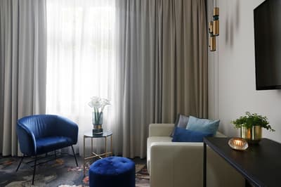 Moquette au sol, fauteuils en velours bleu, tableaux ornant le mur, luminaires design, l’ensemble se complète dans des couleurs claires. La chambre est dotée d’un très grand lit avec une literie hypoallergénique et la salle de bains privée est équipée d’une pomme de douche hydromassante. Elle comprend un fer et une planche à repasser sur demande pour des habits impeccables. Ambiance relaxante !