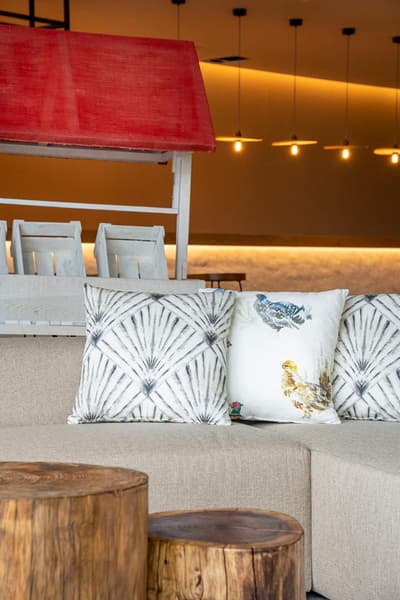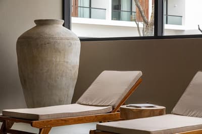 La décoration est plutôt minimaliste avec un élégant mobilier en bois, des pièces faisant référence à l'artisanat de la région et l’ensemble se complète dans des tons clairs. La chambre est dotée d’un lit double de 1,60 m et de deux lits simples. La salle de bains en marbre est équipée d’une baignoire. Ambiance cosy !